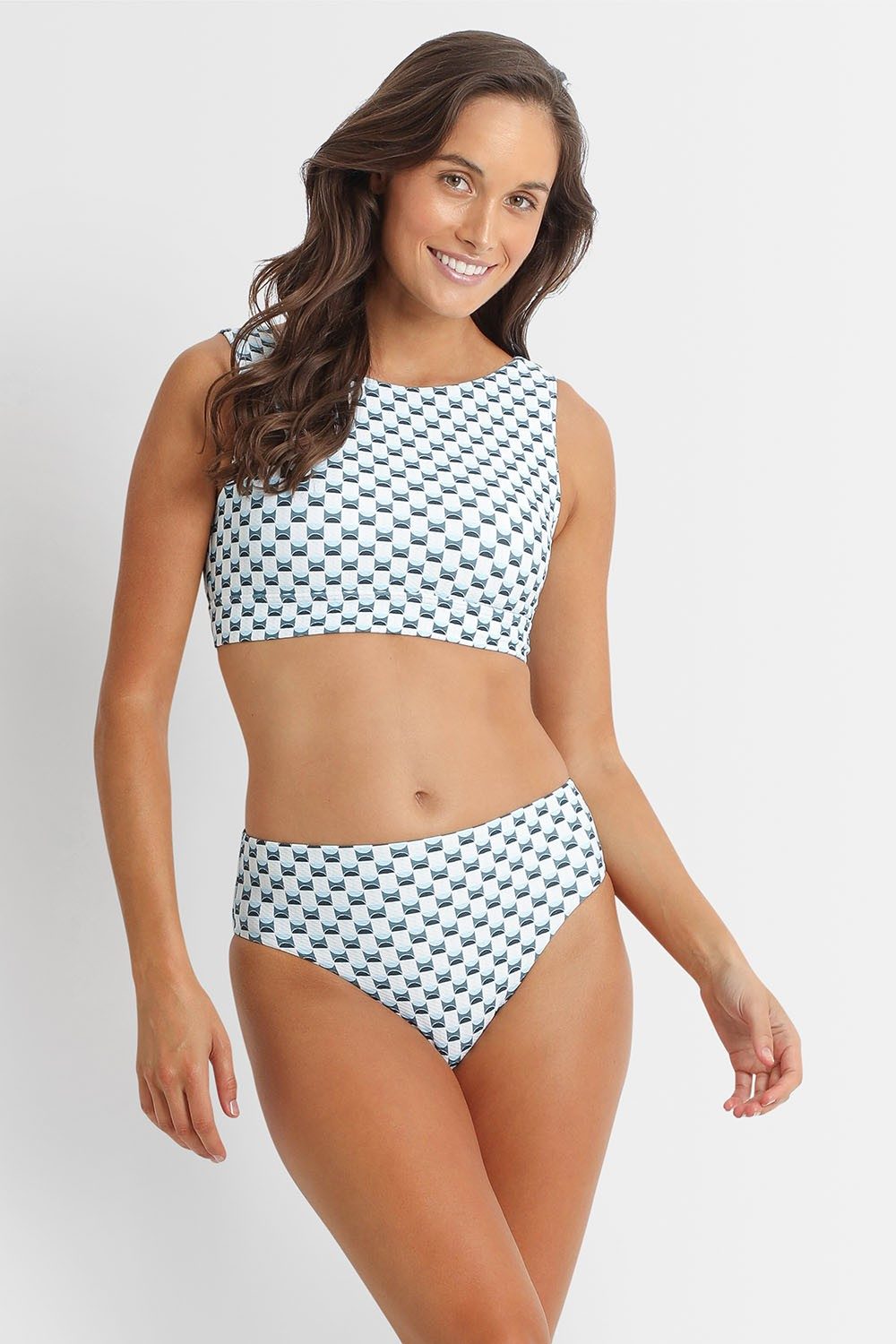 A beautifully considered silhouette. Our Crop Top features a high neckline offering graceful coverage for added sun protection, while fixed soft cups and discreet pockets support prosthesis placement with comfort and confidence. A layer of underbust powermesh gently lifts, while the square back flatters your flame and secures easily with a clip-closure.