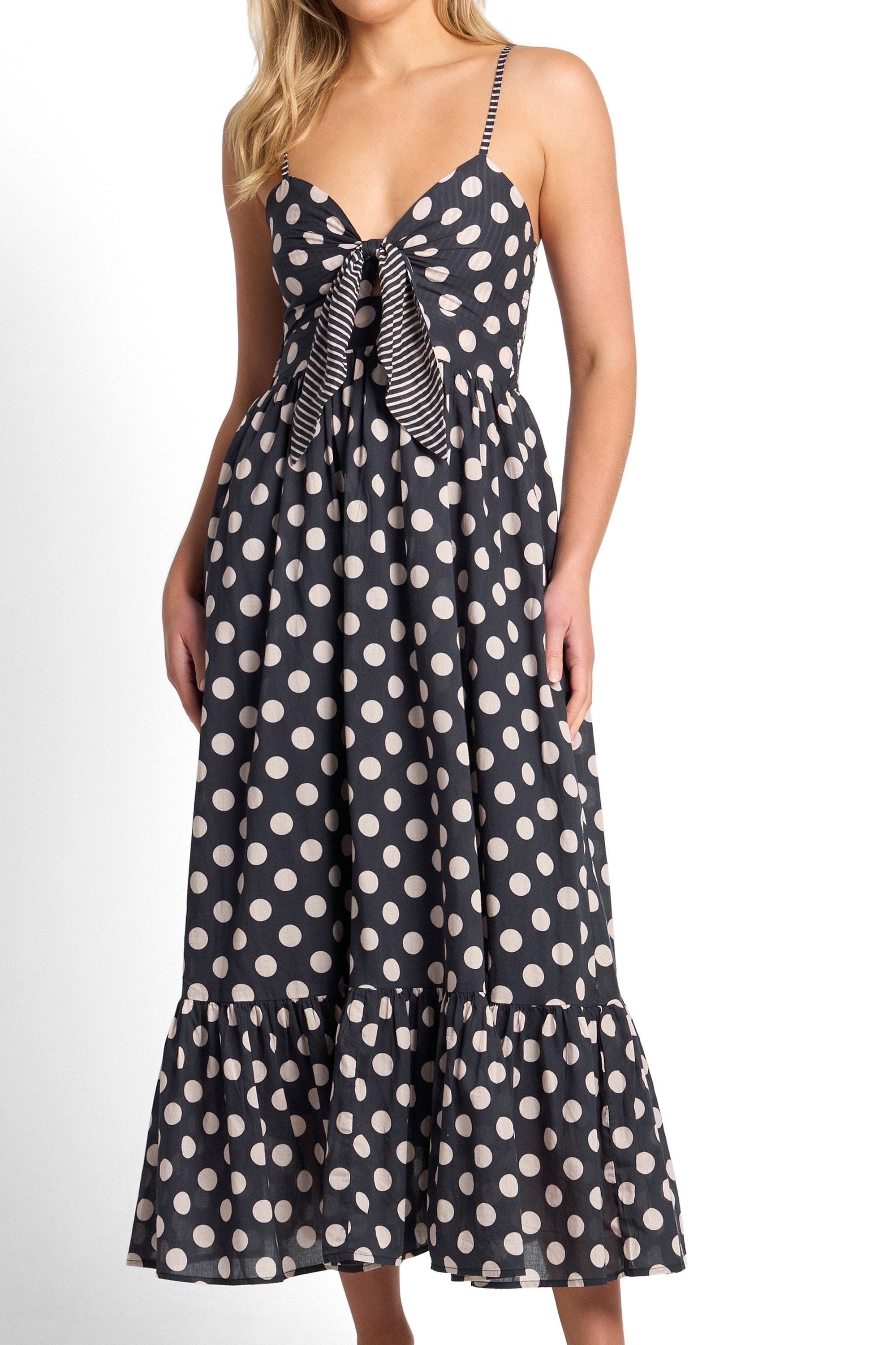This sundress is calling your name. Featuring thin straps that lead to a plunging tie front neckline, a gathered waist to amplify your curves, as well as a frill hemline that kisses the floor. It's the easiest way to look dressed up before and after the beach.
