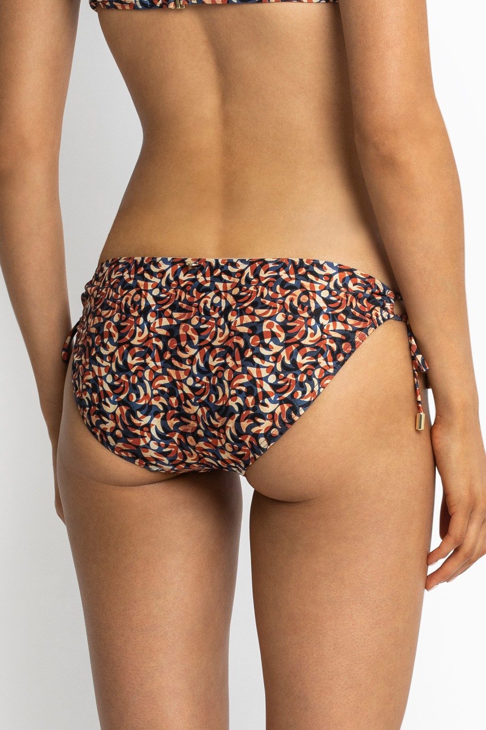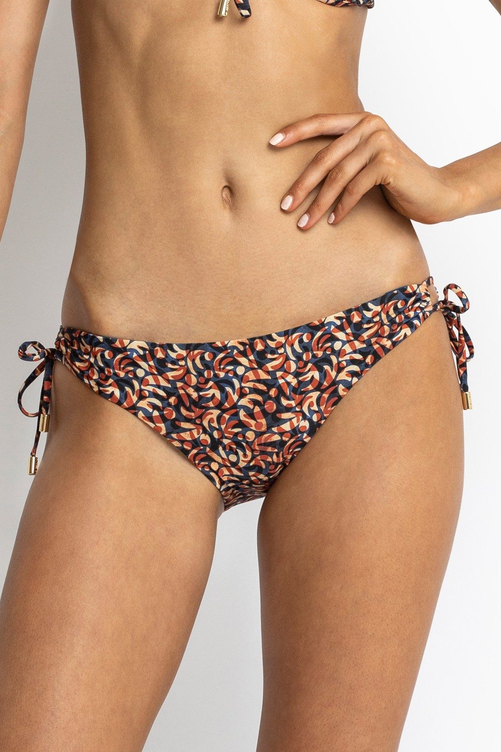 The Tie Side Pant brings all the flirty energy. Designed with a flattering low-rise fit and classic coverage, it features adjustable side ties that thread through dual loops for a luxe twist. Long, elegant cords drape softly at the hips, finished with polished metallic hardware for a touch of shine.