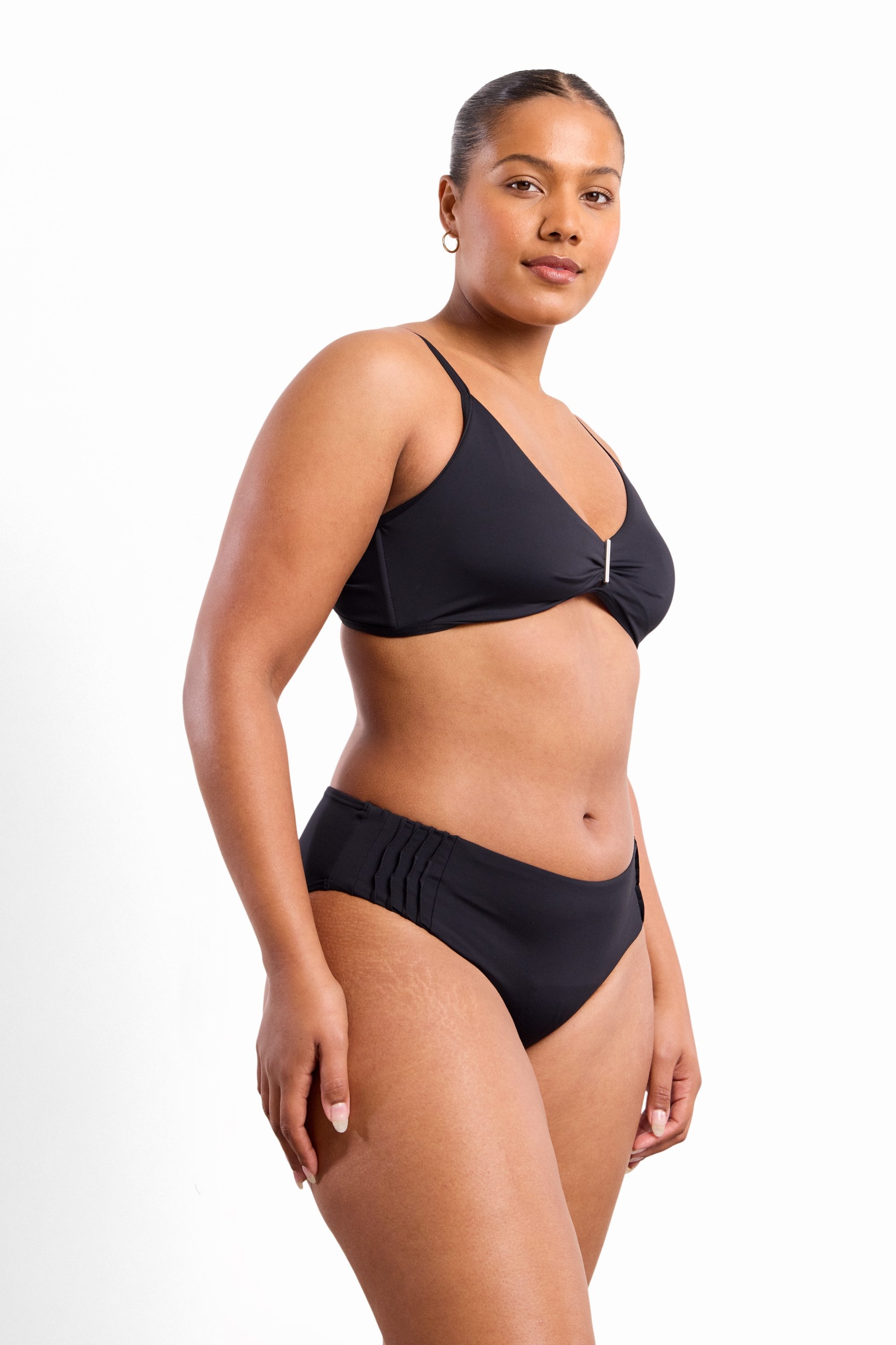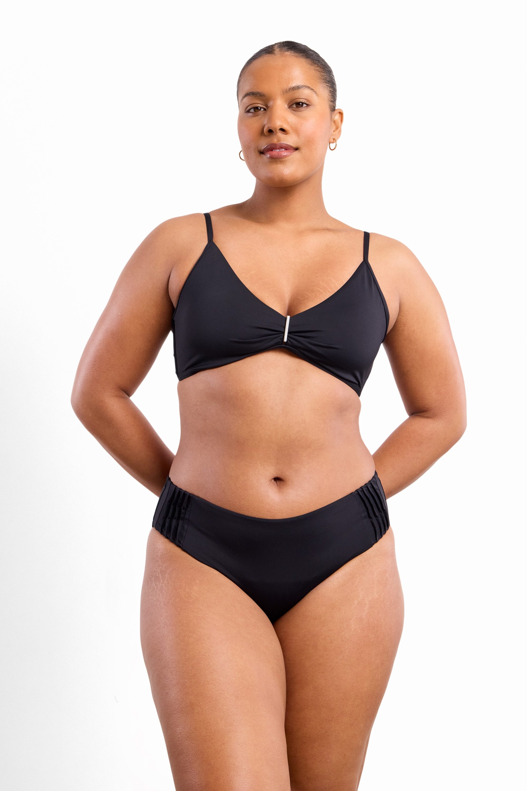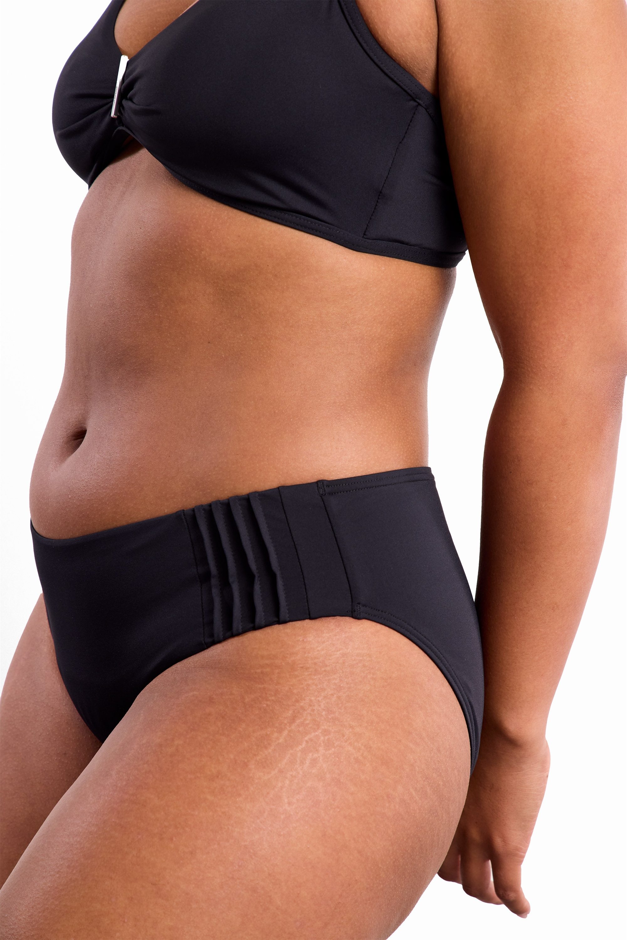 A cut that celebrates your shape. Our Pintuck Mid Rise Pant sits 2-3 inches below the belly button, offering medium coverage and a flattering, slightly lifted fit around the hips. Whether you're looking for extra tummy support or just want a pant that stays put, this style is designed to suit all bodies.